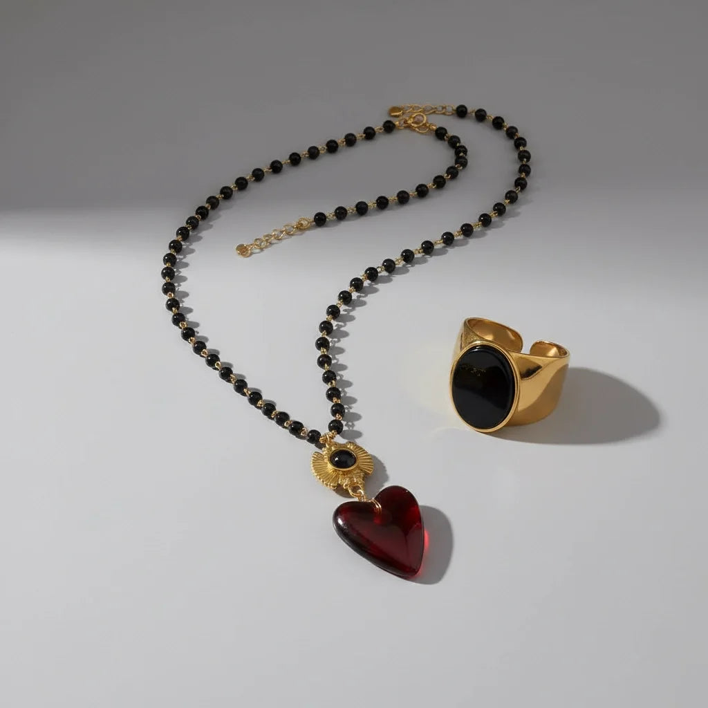 Gold Luxe Statement Jewelry Bundle with Heart Necklace and Black Stone Ring